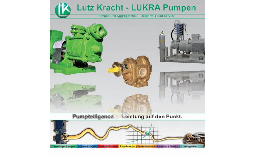 Pumptelligence - Leistung auf den Punkt. Qualitativ hochwertige Pumpen, Aggregate und Anlagen von Lutz Kracht - LUKRA Pumpen kommen in der Ölhydraulik und Wasserwirtschaft zum Einsatz. Seit der Gründung im Jahre 1983 bietet Lutz Kracht - LUKRA Pumpen seinen Kunden die zweckmäßigste Technologie für die jeweils spezifischen Anforderungen. Mit einer umfangreichen Produktpalette, konstanter Zuverlässigkeit, kurzen und verlässlichen Lieferzeiten sowie umfassendem Kundenservice hat sich Lutz Kracht - LUKRA Pumpen zu einem national und international tätigen Lieferanten entwickelt. Lutz Kracht - LUKRA Pumpen sieht sich als Lösungsanbieter mit effizienten lokalen Strukturen. Seit 2004 ist Lutz Kracht - LUKRA Pumpen nach DIN EN ISO 9001 zertifiziert und sichert regelmäßig seinen hohen Qualitätsanspruch. Lutz Kracht - LUKRA Pumpen - Pumpen und Aggregatebau - Reparatur und Service Pumpen, Kreiselpumpen, Hydraulikpumpen, Membranpumpen, Pumpenaggregate, Druckerhöhungsanlagen, Hydraulikanlagen.